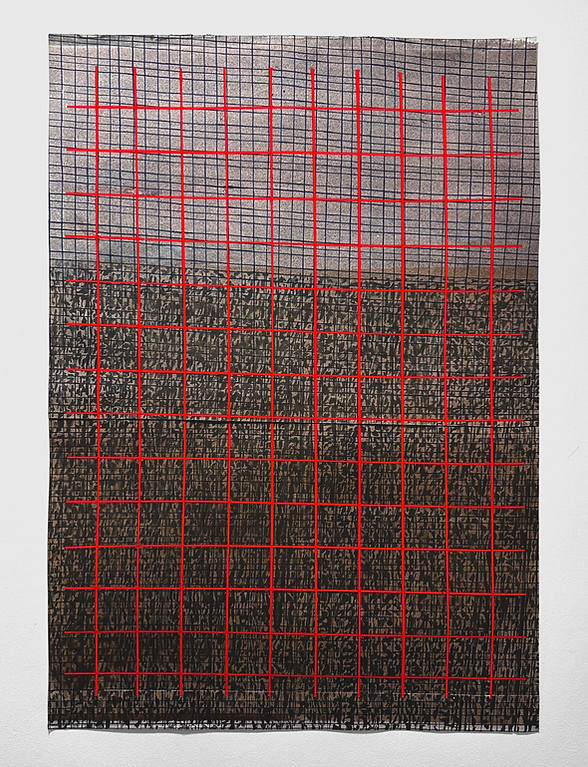 Ink, gouache, flashe paint, salt, on paper on wood panel.
